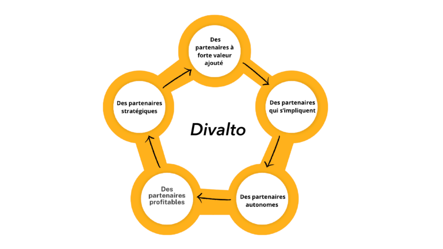 Divalto s’engage à établir des relations durables avec ses partenaires. Cette stratégie inclut un soutien commercial avant-vente, une assistance lors des démonstrations clients, et un appui continu pour assurer le succès des projets. Les partenaires sont vus comme des alliés stratégiques, avec lesquels Divalto cherche à co-construire des réussites à long terme. Divalto sélectionne ses partenaires sur des critères rigoureux : ancrage local, engagement et vision stratégique commune, solidité et fiabilité économique, méthodologie de projet structurée, expertise métier, formation et certification, et orientation sur la satisfaction clients.